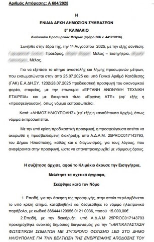 Συνεδρίασε σήμερα Παρασκευή 1 Αυγούστου το 5ο Κλιμάκιο της Ενιαίας Αρχής Δημοσίων Συμβάσεων και κατά τη διαδικασία λήψης προσωρινών μέτρων, δέχθηκε το αίτημα αναστολής – προσωρινών μέτρων της προσφεύγουσας εταιρείας κατά του διαγωνισμού για τα LED και σύμφωνα με την απόφαση που εξέδωσε άμεσα: