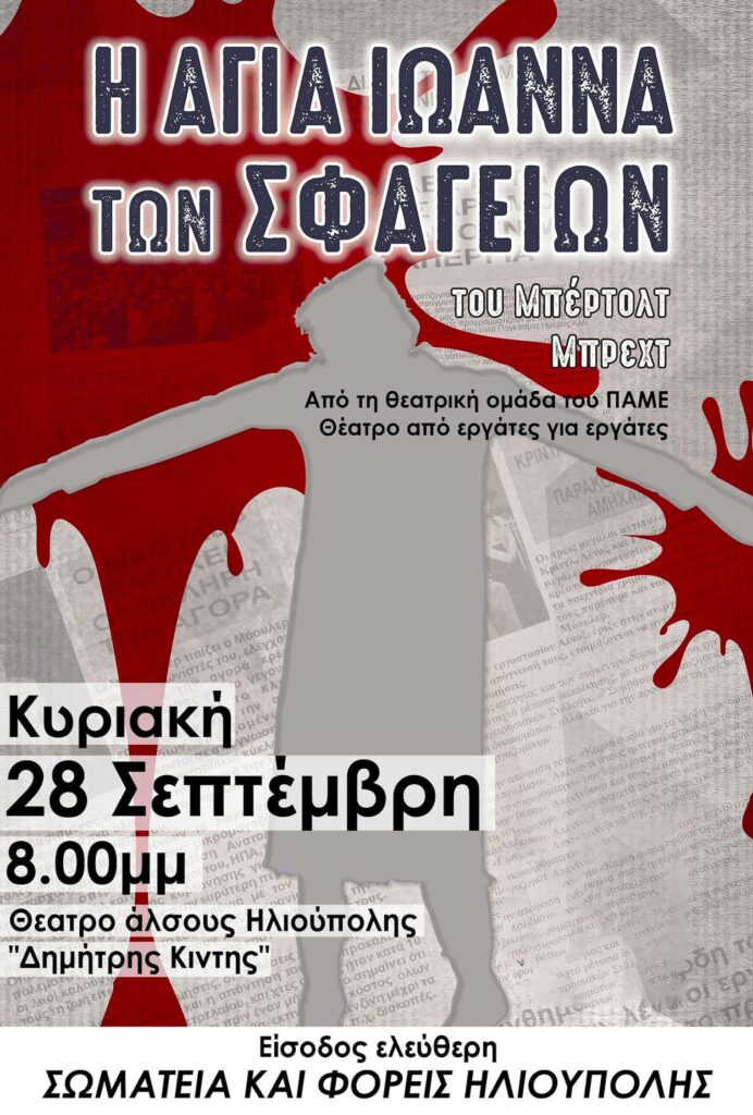 Η Θεατρική Ομάδα του ΠΑΜΕ, “Θέατρο από εργάτες για εργάτες” παρουσιάζει την παράσταση “Η Αγία Ιωάννα των Σφαγείων” βασισμένη στο έργο του Μπερτολτ Μπρεχτ, στο δημοτικό άλσος “Δημήτρης Κιντής”, την Κυριακή 28 Σεπτέμβρη στις 20:00, με ελεύθερη είσοδο για το κοινό.