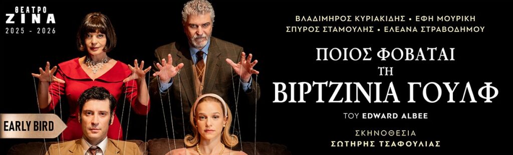 Το εμβληματικό έργο του Έντουαρντ Άλμπυ, “Ποιος φοβάται τη Βιρτζίνια Γουλφ“, ένα από τα πιο συγκλονιστικά και βαθιά ανθρώπινα θεατρικά έργα του 20ού αιώνα, ανεβαίνει στο Θέατρο Ζίνα, Λεωφ. Αλεξάνδρας 74, σε σκηνοθεσία Σωτήρη Τσαφούλια. Οι παραστάσεις θα διαρκέσουν από 9 Οκτωβρίου έως 21 Δεκεμβρίου 2025.