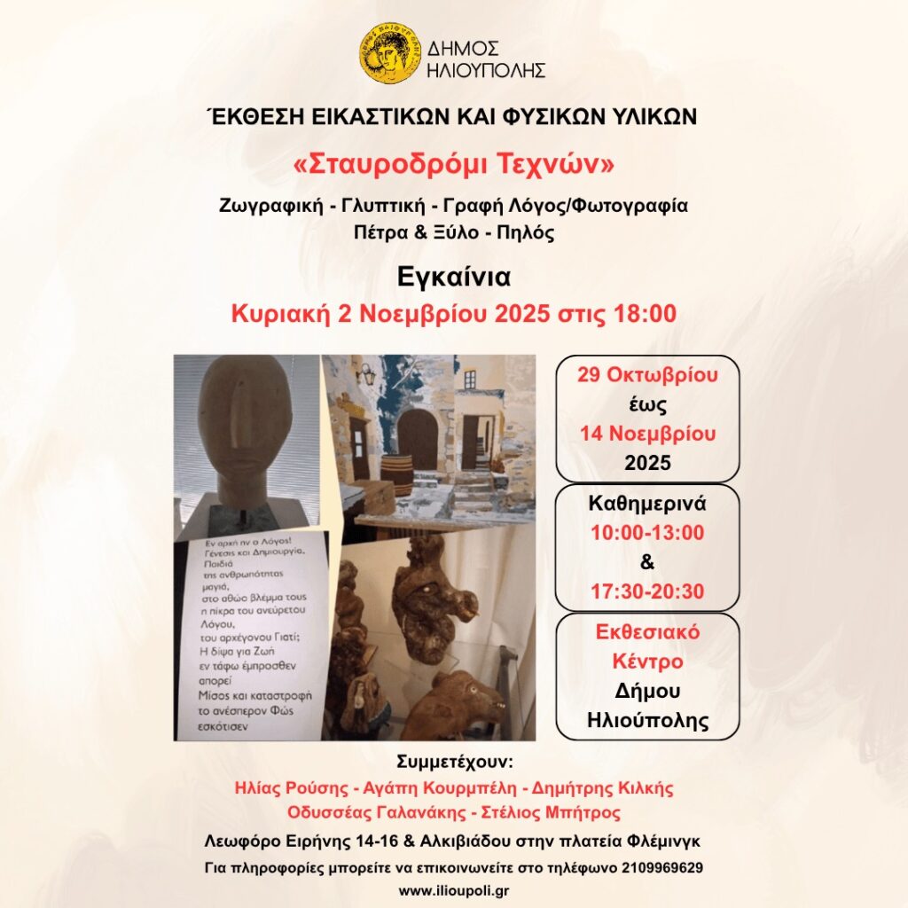 O Δήμος Ηλιούπολης προσκαλεί στην Έκθεση Εικαστικών και Φυσικών Υλικών (Ζωγραφική- Γλυπτική-Γραφή Λόγος/Φωτογραφία – Πέτρα & Ξύλο – Πηλός) με τίτλο “Ʃταυροδρόμι Τεχνών” που συμμετέχουν ο Ηλίας Ρούσης, η Αγάπη Κουρμπέλη, ο Δημήτρης Κιλκής, ο Οδυσσέας Γαλανάκης και ο Ʃτέλιος Μπήτρος.