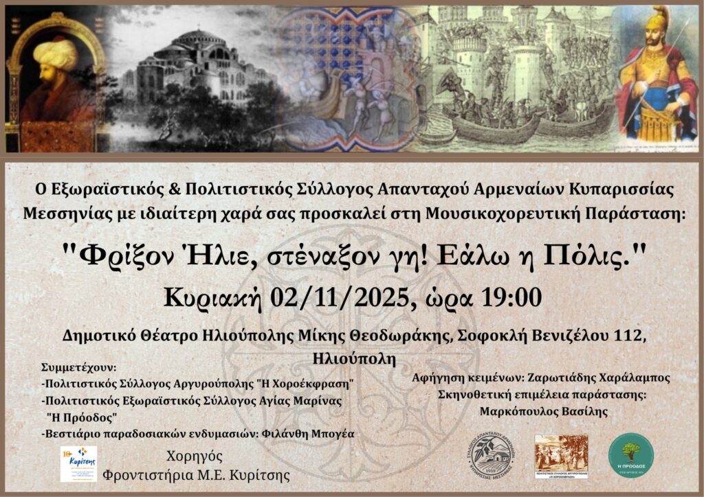 Ο “Εξωραϊστικός & Πολιτιστικός Σύλλογος Απανταχού Αρμεναίων Κυπαρισσίας Μεσσηνίας” διοργανώνει μια παράσταση που ενώνει μουσική, χορό και λόγο σε μια συγκινητική αναδρομή στην ίδρυση και την Άλωση της Πόλης και στην πνευματική της κληρονομιά, με τίτλο “Φρίξον Ήλιε, στέναξον γη! Εάλω η Πόλις.“, την Κυριακή 2 Νοεμβρίου 2025, στις 19:00, στο Δημοτικό Θέατρο Ηλιούπολης “Μίκης Θεοδωράκης”, Σοφ. Βενιζέλου 112.