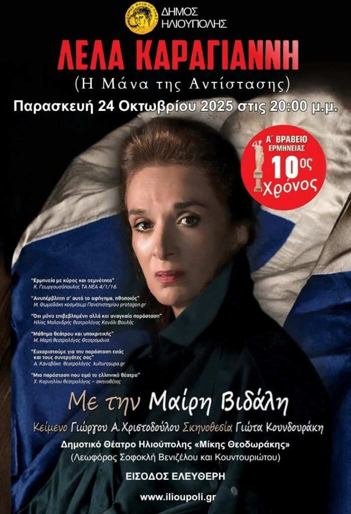 Ο Δήμος Ηλιούπολης μας προσκαλεί στην θεατρική παράσταση με τίτλο “Λέλα Καραγιάννη, η μάνα της Αντίστασης” που θα πραγματοποιηθεί με Ελεύθερη Είσοδο την Παρασκευή 24 Οκτωβρίου 2025, στις 20:00, στο Δημοτικό Θέατρο Ηλιούπολης “Μίκης Θεοδωράκης”, Λεωφ. Σοφ. Βενιζέλου και Κουντουριώτου, στο Δημαρχείο της Ηλιούπολης.