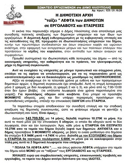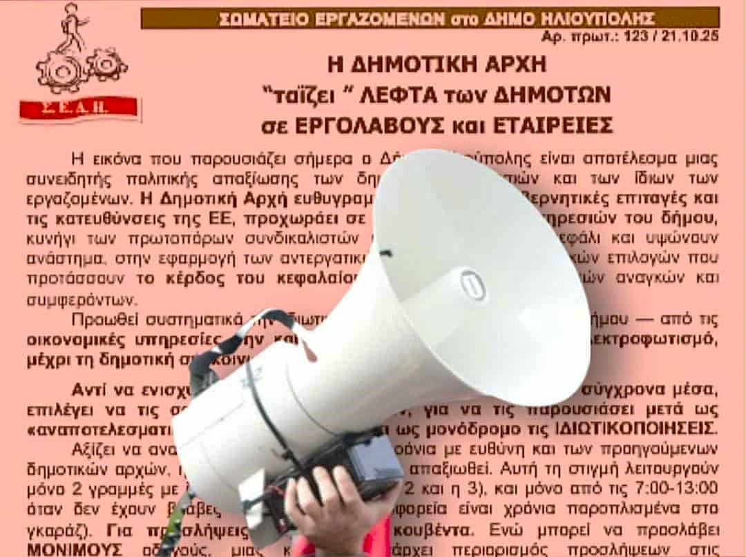 Ολόκληρη η ανακοίνωση του Σωματείου Εργαζομένων στο Δήμο Ηλιούπολης: