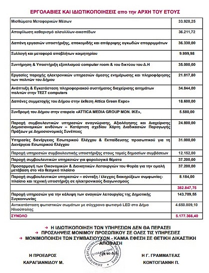 Τέλος αποκαλύπτει τις τεράστιες δαπάνες, για τα δεδομένα της σημερινής οικονομικής κατάστασης της κοινωνίας, για κάθε λογής συμβουλευτικές, επικοινωνιακές και εργολαβίες εκχώρησης δημοτικών υπηρεσιών σε ιδιώτες, με ποσά που προκαλούν τη λογική και ζαλίζουν.