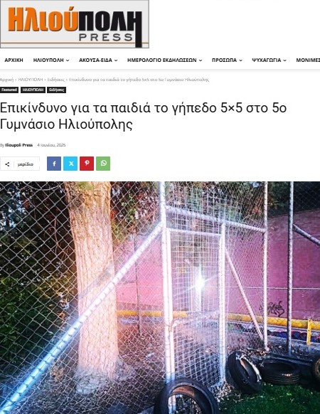 ΕΔΩ στο ilioupolipress.gr δημοσιεύσαμε στις 4 Ιουνίου 2025 κείμενο διαμαρτυρίας που μας έστειλε συμπολίτης, για την κατάσταση του συγκεκριμένου γηπέδου 5 Χ 5 και σχετικές φωτογραφίες, ώστε “να ευαισθητοποιηθούν οι αρμόδιοι και να αποφασίσουν έστω και μέσα στην καλοκαιρινή περίοδο, να κάνουν ό,τι πρέπει για να διασφαλιστεί η ακεραιότητα των παιδιών που το χρησιμοποιούν”.