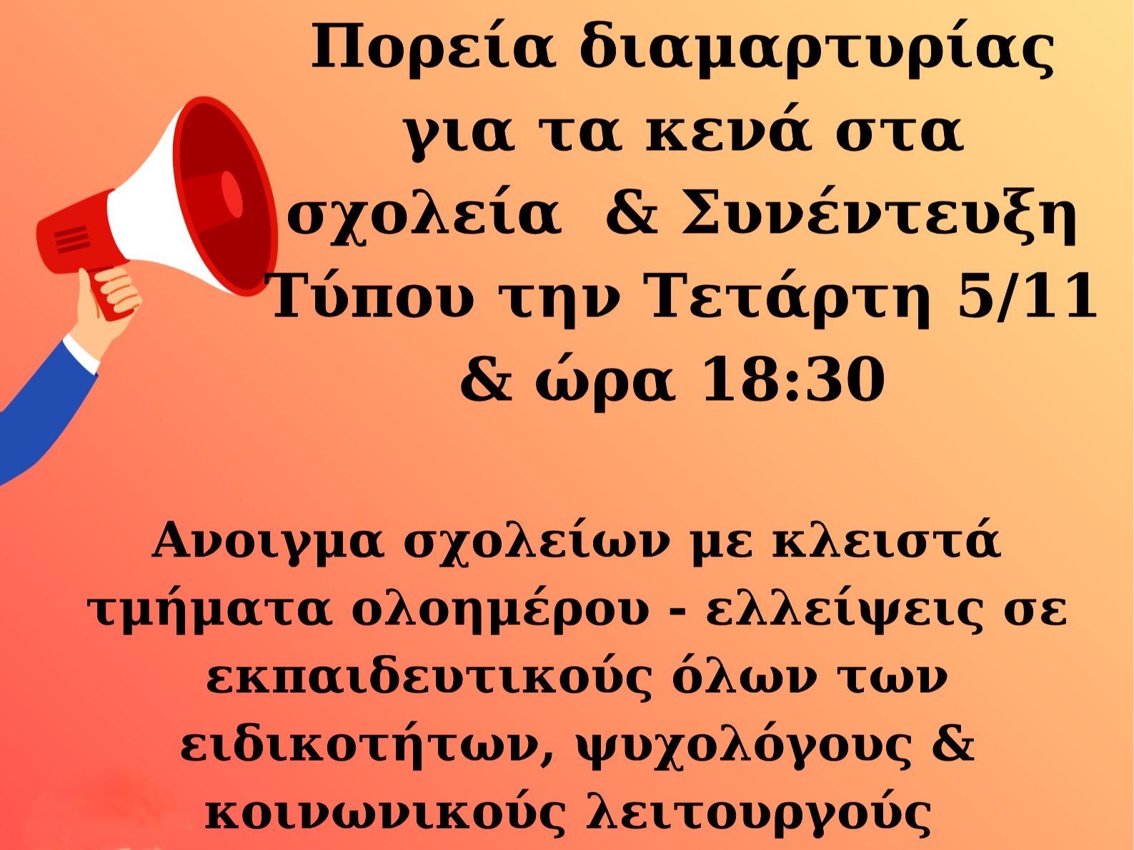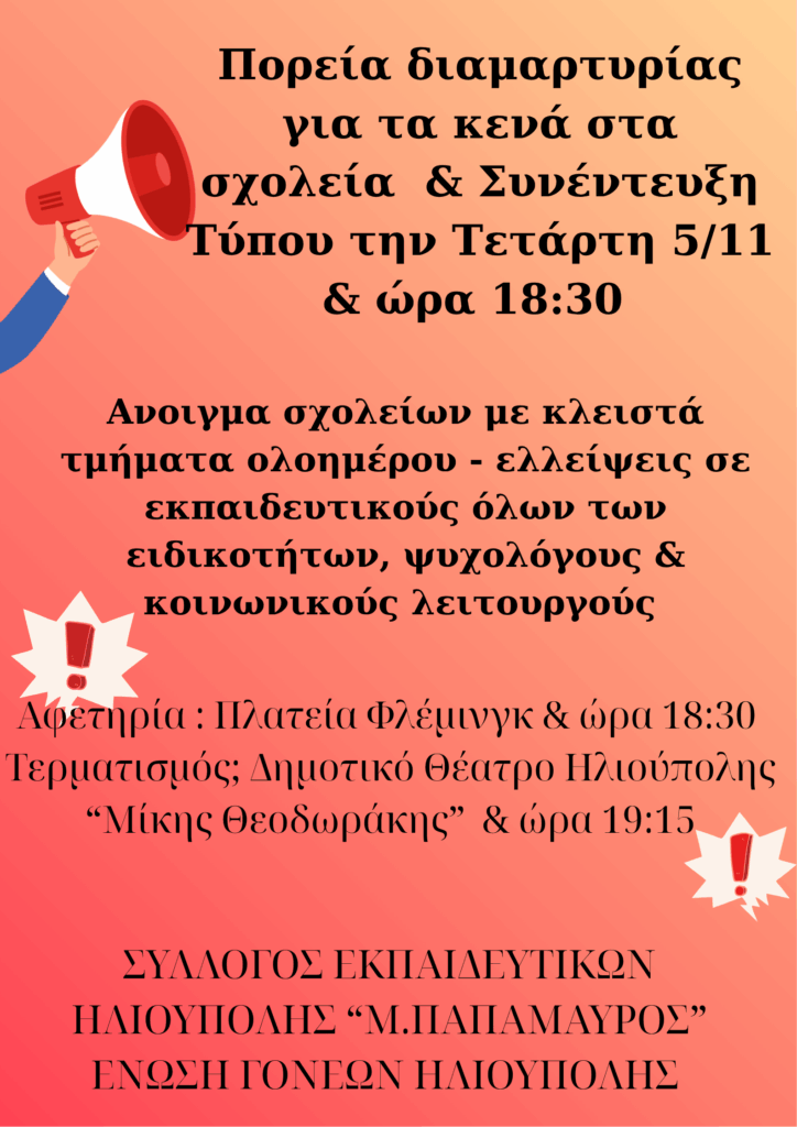 Ο “Σύλλογος Εκπαιδευτικών Ηλιούπολης – Μ. Παπαμαύρος” καλεί τα μέλη του Συλλόγου, την Ένωση Γονέων Ηλιούπολης, τους Συλλόγους Γονέων Δημοτικών & Νηπιαγωγείων, τους φορείς της Ηλιούπολης, γονείς, εκπαιδευτικούς και μαθητές, σε πορεία διαμαρτυρίας την Τετάρτη 5 Νοεμβρίου στις 18:30, που θα ξεκινήσει από την Πλατεία Φλέμινγκ με προορισμό το Δημαρχείο και στη συνέντευξη τύπου, που θα δοθεί στο Θέατρο του Δήμου Ηλιούπολης, με αιτήματα: