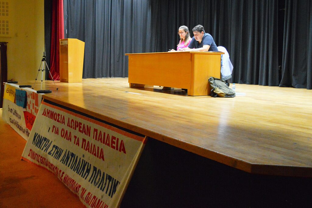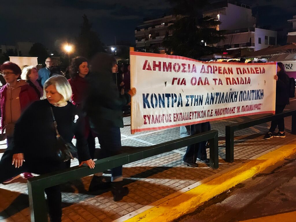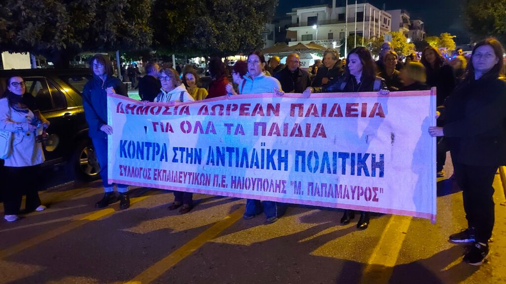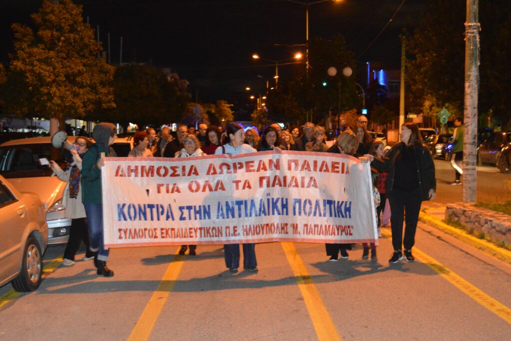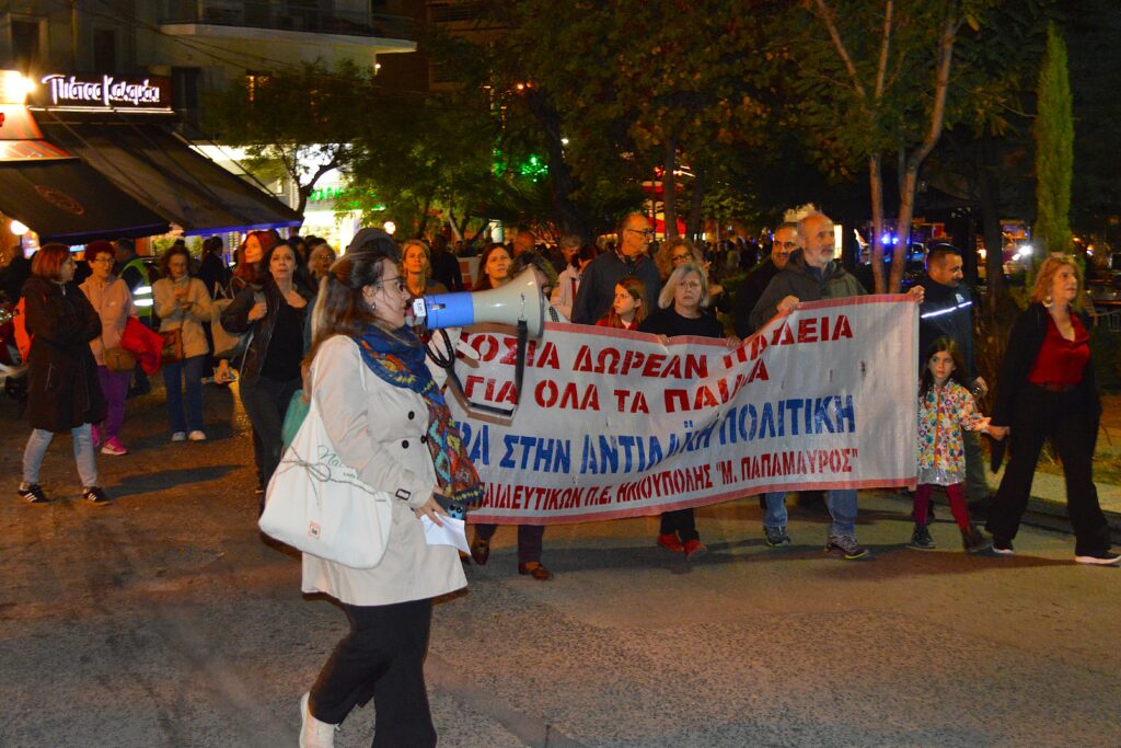 📌 Στην κεφαλή της πορείας ήταν το πανό του Συλλόγου Εκπαιδευτικών με το σύνθημα “Δημόσια δωρεάν Παιδεία για όλα τα παιδιά, κόντρα στην αντιλαϊκή πολιτική” και πιο πίσω το πανό που κρατούσαν μέλη του ΔΣ της Ένωσης Γονέων, με το σύνθημα “Σύγχρονα και ασφαλή σχολεία“, ενώ ακολουθούσαν εκπαιδευτικοί, μαθητές, γονείς με καρότσια και πολίτες.