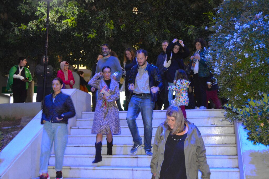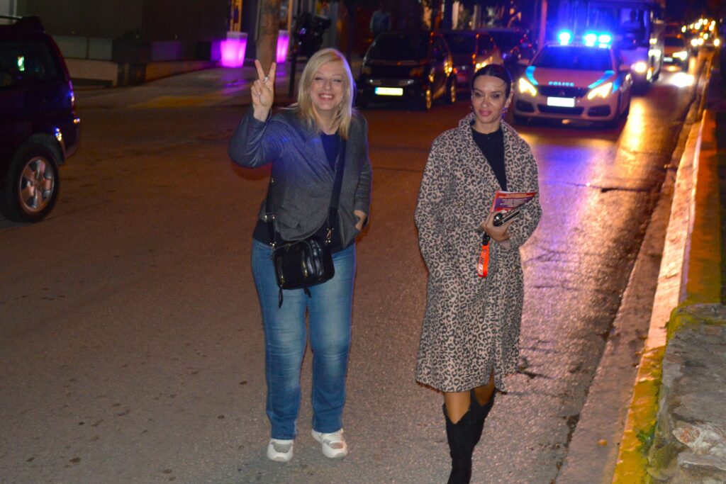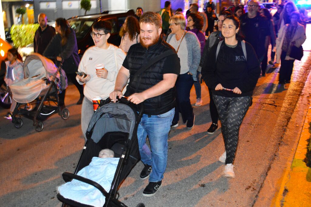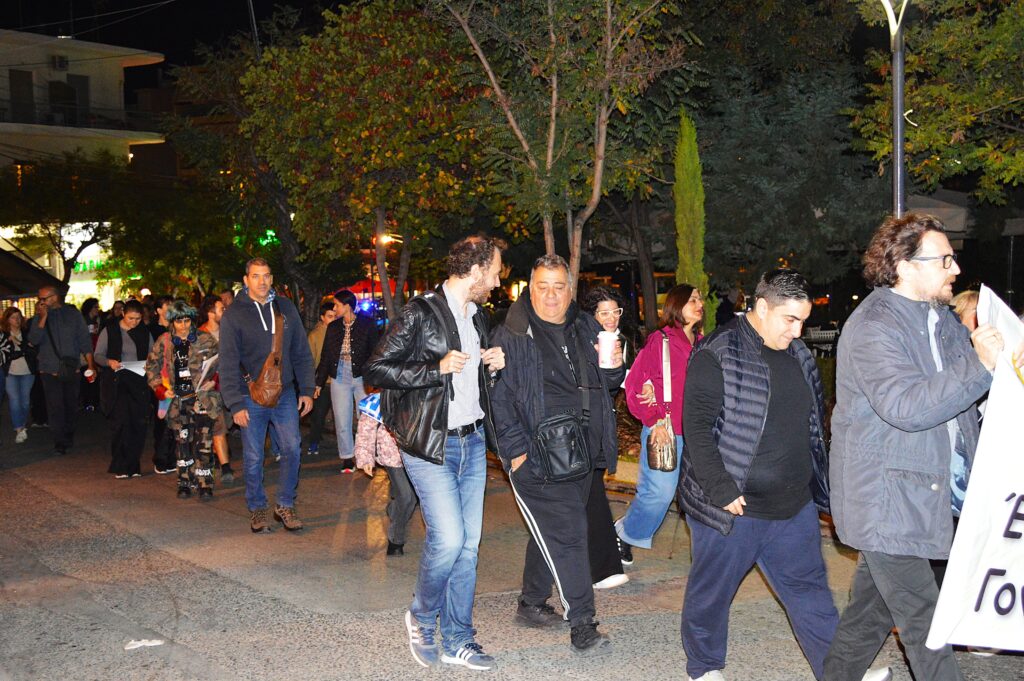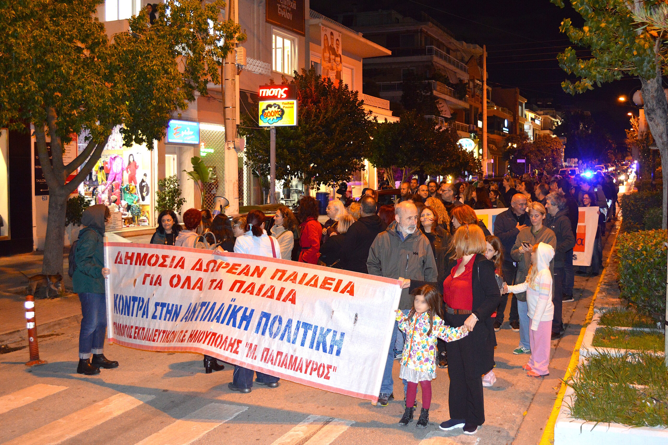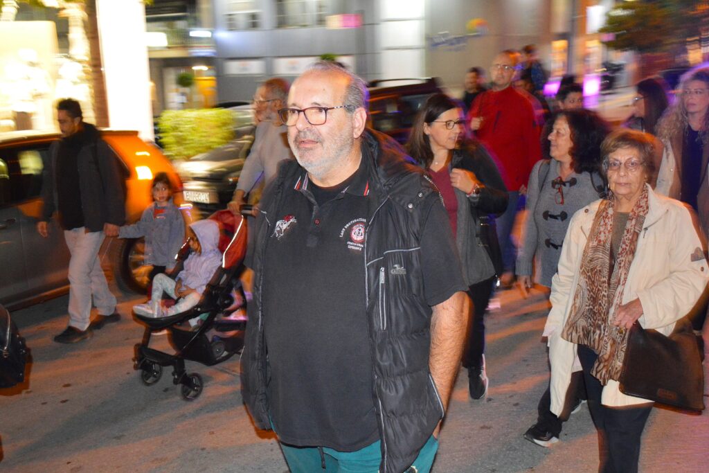🟦 Ευτυχώς που υπήρχε και ο φωτισμός των καταστημάτων, ο μπλε φάρος του αστυνομικού οχήματος και τα φώτα των αυτοκινήτων που υπομονετικά ακολουθούσαν την πορεία, ώστε να διακρίνονται κάπως τα δύο πανό και η φάλαγγα των συμμετεχόντων.