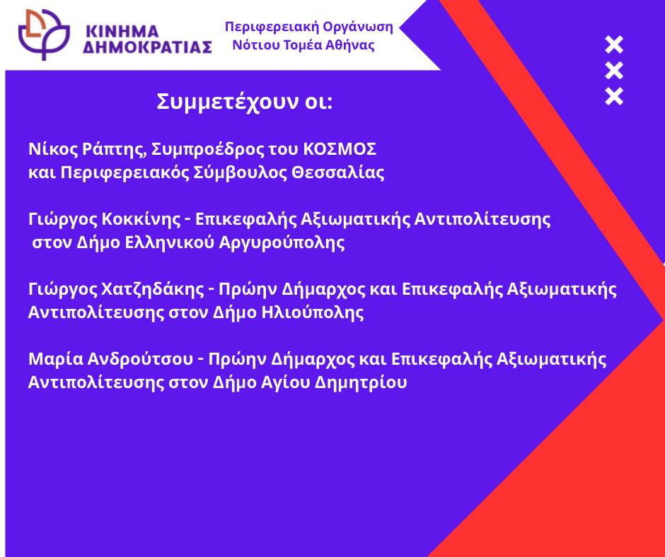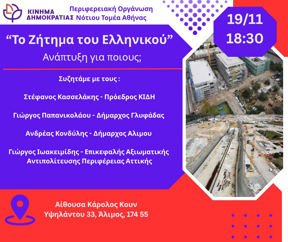 Η Περιφερειακή Οργάνωση Νότιου Τομέα Αθήνας του “Κινήματος Δημοκρατίας” διοργανώνει ανοιχτή εκδήλωση – συζήτηση με θέμα, “Το ζήτημα του Ελληνικού: Ανάπτυξη για ποιους;“, που θα γίνει την Τετάρτη 19 Νοεμβρίου, στις 18:30, στην Αίθουσα “Κάρολος Κουν”, στην οδό Υψηλάντου 33, στον Άλιμο.