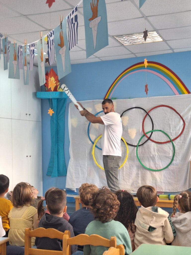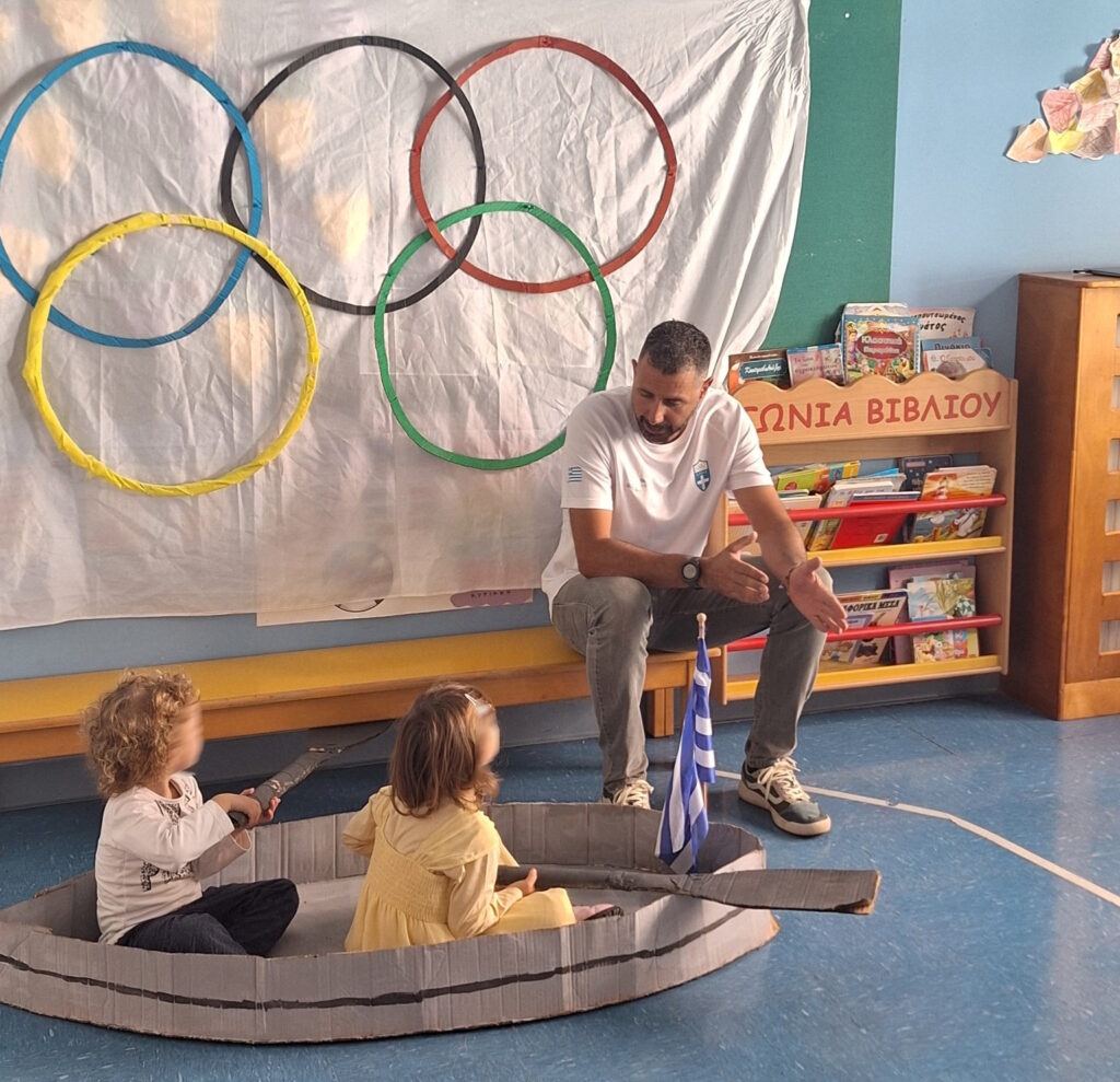 Έγινε αναπαράσταση της αφής της Ολυμπιακής Φλόγας σε μία τάξη που διαμορφώθηκε σε πλατφόρμα Ολυμπιακών Αγώνων και παράλληλα σε μία προσομοίωση κωπηλατικού σκάφους, που κατασκεύασαν από χαρτόνι τα ίδια τα παιδάκια, ο Δημ. Μούγιος τους παρουσίασε το Ολυμπιακό Άθλημα της Κωπηλασίας, συμβάλλοντας έτσι στον Αθλητικό Προσανατολισμό τους!!!