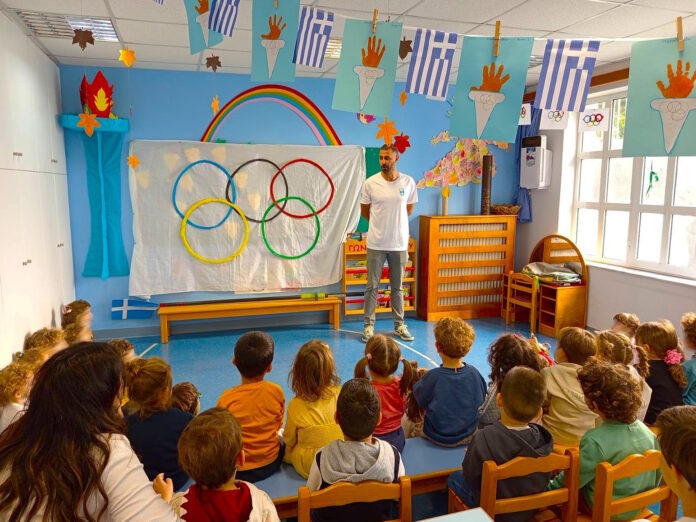 Έγινε αναπαράσταση της αφής της Ολυμπιακής Φλόγας σε μία τάξη που διαμορφώθηκε σε πλατφόρμα Ολυμπιακών Αγώνων και παράλληλα σε μία προσομοίωση κωπηλατικού σκάφους, που κατασκεύασαν από χαρτόνι τα ίδια τα παιδάκια, ο Δημ. Μούγιος τους παρουσίασε το Ολυμπιακό Άθλημα της Κωπηλασίας, συμβάλλοντας έτσι στον Αθλητικό Προσανατολισμό τους!!!