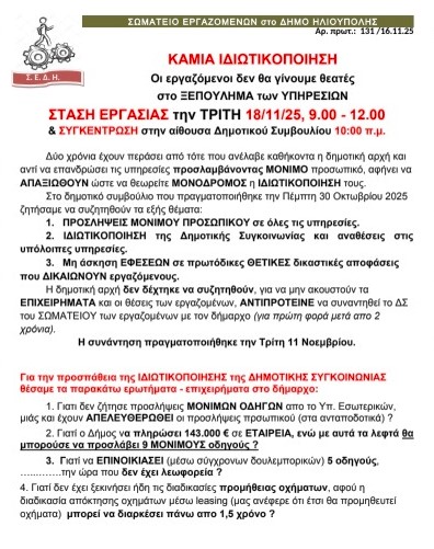 Το “Σωματείο Εργαζομένων στο Δήμο Ηλιούπολης” έχει καταρρίψει όλους τους ισχυρισμούς της εισήγησης, αφού στην πρόσφατη σχετική ανακοίνωσή του, τονίζεται ότι: