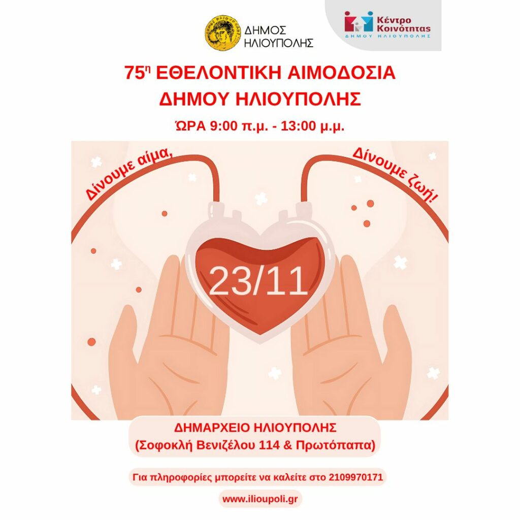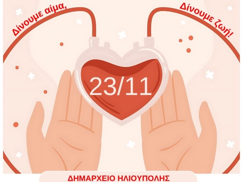 Η Αιμοδοσία θα πραγματοποιηθεί στο Δημαρχείο της Ηλιούπολης, την Κυριακή 23 Νοεμβρίου 2025, από 09:00 έως 13:00, με απαραίτητη την προσκόμιση του ΑΜΚΑ.