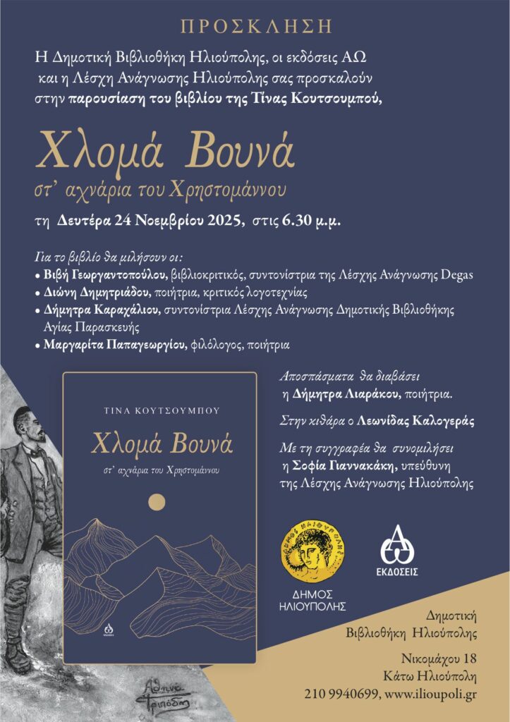 Η Δημοτική Βιβλιοθήκη Ηλιούπολης σε συνεργασία με τη Λέσχη Ανάγνωσης Ηλιούπολης θα παρουσιάσουν το μυθιστόρημα “Χλομά βουνά-στ’ αχνάρια του Χρηστομάννου“, της συγγραφέως Τίνας Κουτσουμπού, στην αίθουσα της Δημοτικής Βιβλιοθήκης, τη Δευτέρα 24 Νοεμβρίου 2025, στις 18:30.