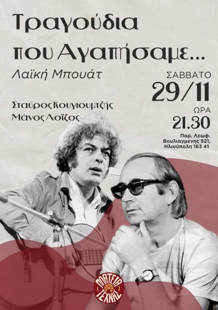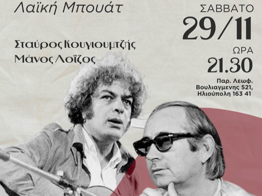 Λαϊκή Μπουάτ στην Πλατεία Τέχνης με “Τραγούδια που αγαπήσαμε – Λοΐζος & Κουγιουμτζής“, το Σάββατο 29 Νοεμβρίου 2025, στις 21:30, σε μια ζεστή μουσική βραδιά, αφιερωμένη στα διαχρονικά τραγούδια του Μάνου Λοΐζου και του Σταύρου Κουγιουμτζή.