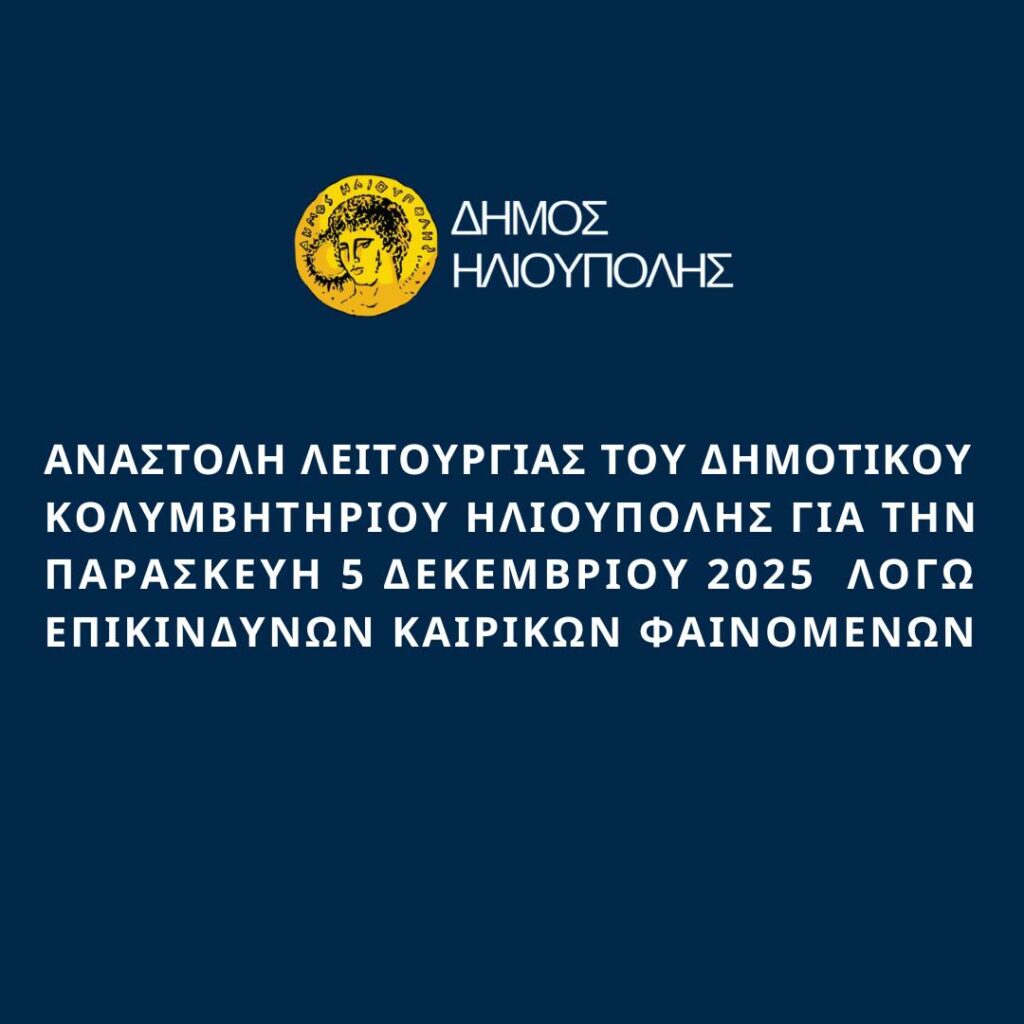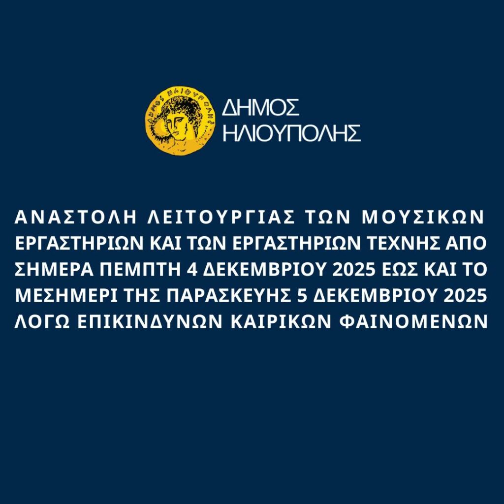 Ακολούθησε, λίγο αργότερα, η απόφαση του Δημάρχου Ηλιούπολης, με την οποία αναστέλλεται η λειτουργία όλων των σχολικών μονάδων Πρωτοβάθμιας, Δευτεροβάθμιας Εκπαίδευσης και των Δημοτικών Παιδικών-Βρεφονηπιακών Σταθμών του Δήμου Ηλιούπολης, για την Παρασκευή 5 Δεκεμβρίου 2025, λόγω επικίνδυνων καιρικών φαινομένων.