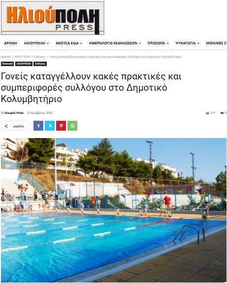 Με την παρούσα επιστολή επιθυμούμε να επισημάνουμε, με τον πιο κατηγορηματικό τρόπο, τη συνεχιζόμενη αδράνεια της Δημοτικής Αρχής στα ζητήματα που τέθηκαν κατά τη συνεδρίαση του Δημοτικού Συμβουλίου της 27ης Νοεμβρίου 2025 και αφορούν την προστασία ανήλικων αθλητών στο Κολυμβητήριο Ηλιούπολης.