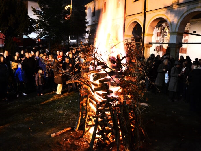 Το βράδι της προπαραμονής της γιορτής, μαζεύονται στα χωριά ή στις γειτονιές των πόλεων και ανάβουν μεγάλες φωτιές, γύρω από τις οποίες κάθονται μέχρι το πρωί, τρώνε νηστίσιμους κυρίως μεζέδες που φέρνουν από τα σπίτια τους, ανταλλάσσουν ευχές για υγεία και ευτυχία, πίνουν ζεστό κρασί ή ρακί, τραγουδούν παραδοσιακά τραγούδια και χορεύουν γύρω από τη φωτιά. Ο υπεύθυνος για όλη αυτή την προετοιμασία, ο “Kουμ”-кум-κουμπάρος έχει φροντίσει να μαζέψει ξύλα για τη φωτιά ή χρήματα για να αγοραστούν ξύλα και για την παραδοσιακή πίτα σαν καρβέλι με νόμισμα, που όποιος το πετύχει θα είναι ο τυχερός κουμπάρος, για την επόμενη χρονιά.