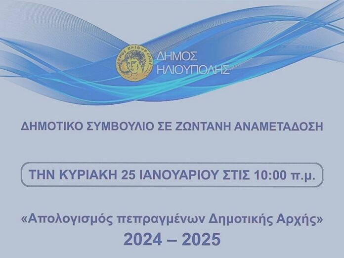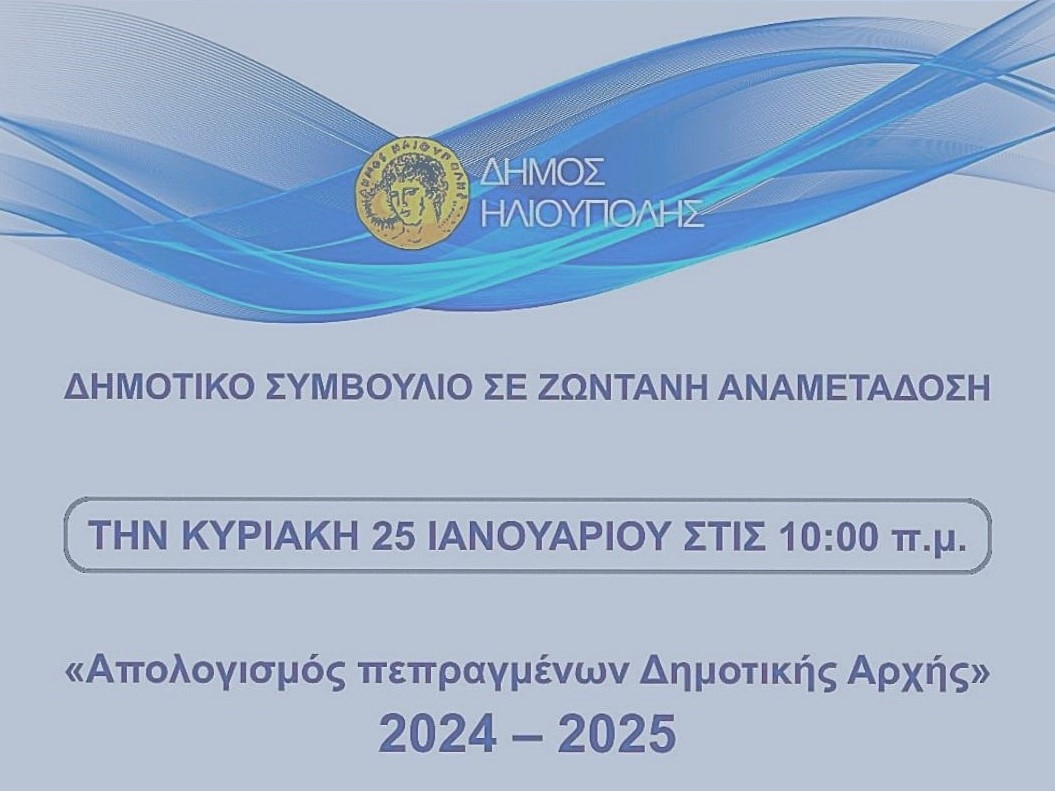 Πραγματοποιείται την Κυριακή 25 Ιανουαρίου 2026, στις 10 πμ, η ειδική δημόσια συνεδρίαση απολογισμού πεπραγμένων της Δημοτικής Αρχής,. Εκτός από τα μέλη του ΔΣ έχουν προσκληθεί να συμμετάσχουν κάτοικοι, συνδικαλιστικοί, επιστημονικοί και κοινωνικοί φορείς του Δήμου.