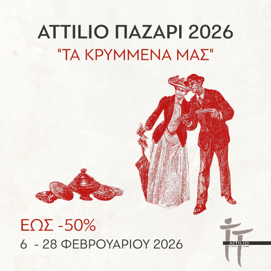 Το γνωστό, ξεχωριστό τοπικό κατάστημα “ATTILIO Οικεία Τέχνη” διοργανώνει και φέτος παζάρι, από τις 9 έως τις 28 Φεβρουαρίου 2026, με τίτλο “Τα κρυμμένα μας – αντικείμενο και κόσμημα“, με εκπτώσεις έως 50%.