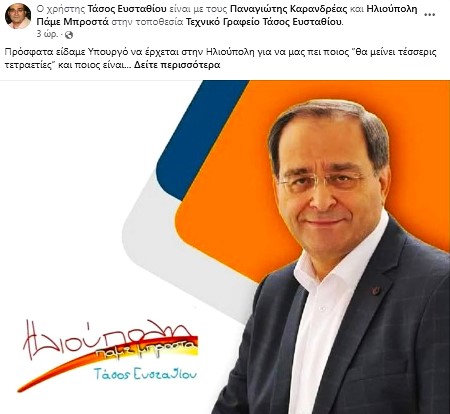 Απασφάλισε ο κ. Τ. Ευσταθίου και με δεύτερη σημερινή του ανάρτηση, “περιποιήθηκε” αυτή τη φορά τον κ. Χάρη Θεοχάρη, Υφυπουργό Εξωτερικών και βουλευτή της περιοχής μας, που παραβρέθηκε στην εκδήλωση κοπής της Πρωτοχρονιάτικής πίτας της διοικούσας παράταξης “Πρώτα η Ηλιούπολη” και είχε τη φαεινή πολιτική έμπνευση να μιλήσει με φλογερά λόγια υπέρ του Δημάρχου της πόλης.