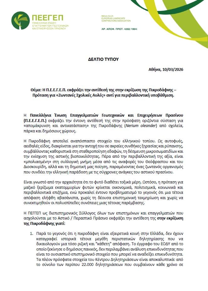 Η Πανελλήνια Ένωση Επαγγελματιών Γεωτεχνικών και Επιχειρήσεων Πρασίνου – Π.Ε.Ε.Γ.Ε.Π. εκφράζει την έντονη αντίθεσή της στην πρόσφατη οριζόντια σύσταση για «απομάκρυνση και αντικατάσταση» της Πικροδάφνης (Nerium oleander) από σχολεία, πάρκα και δημόσιους χώρους.