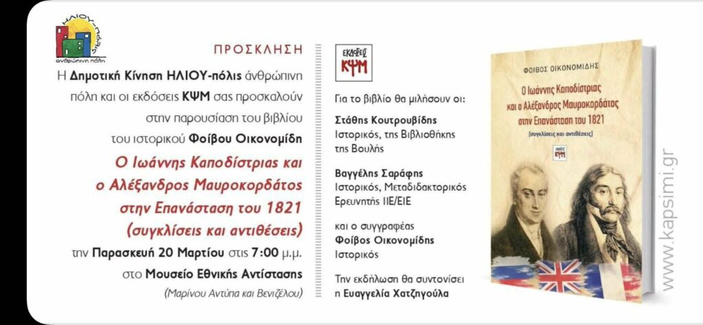 Την Παρασκευή 20 Μαρτίου, στις 19:00, η Δημοτική Κίνηση “ΗΛΙΟΥ-πόλις, ανθρώπινη πόλη” διοργανώνει παρουσίαση του βιβλίου του ιστορικού Φοίβου Οικονομίδη, “Ο Ιωάννης Καποδίστριας και ο Αλέξανδρος Μαυροκορδάτος στην Επανάσταση του 1821 (συγκλίσεις και αντιθέσεις)” των εκδόσεων ΚΨΜ.