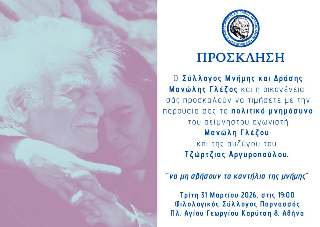 Ο Ναξιώτης συμπολίτης μας κ. Νίκος Λεβογιάννης προσκαλεί στο πολιτικό μνημόσυνο του αείμνηστου Μανώλη Γλέζου και της συζύγου του Τζώρτζιας Αργυροπούλου, που διοργανώνει ο “Σύλλογος Μνήμης και Δράσης Μανώλης Γλέζος” και η οικογένεια, την Τρίτη 31 Μαρτίου 2026, στις 19:00, στην κεντρική αίθουσα του Φιλολογικού Συλλόγου “Παρνασσός”, Πλ. Αγίου Γεωργίου Καρύτση 8, στην Αθήνα.