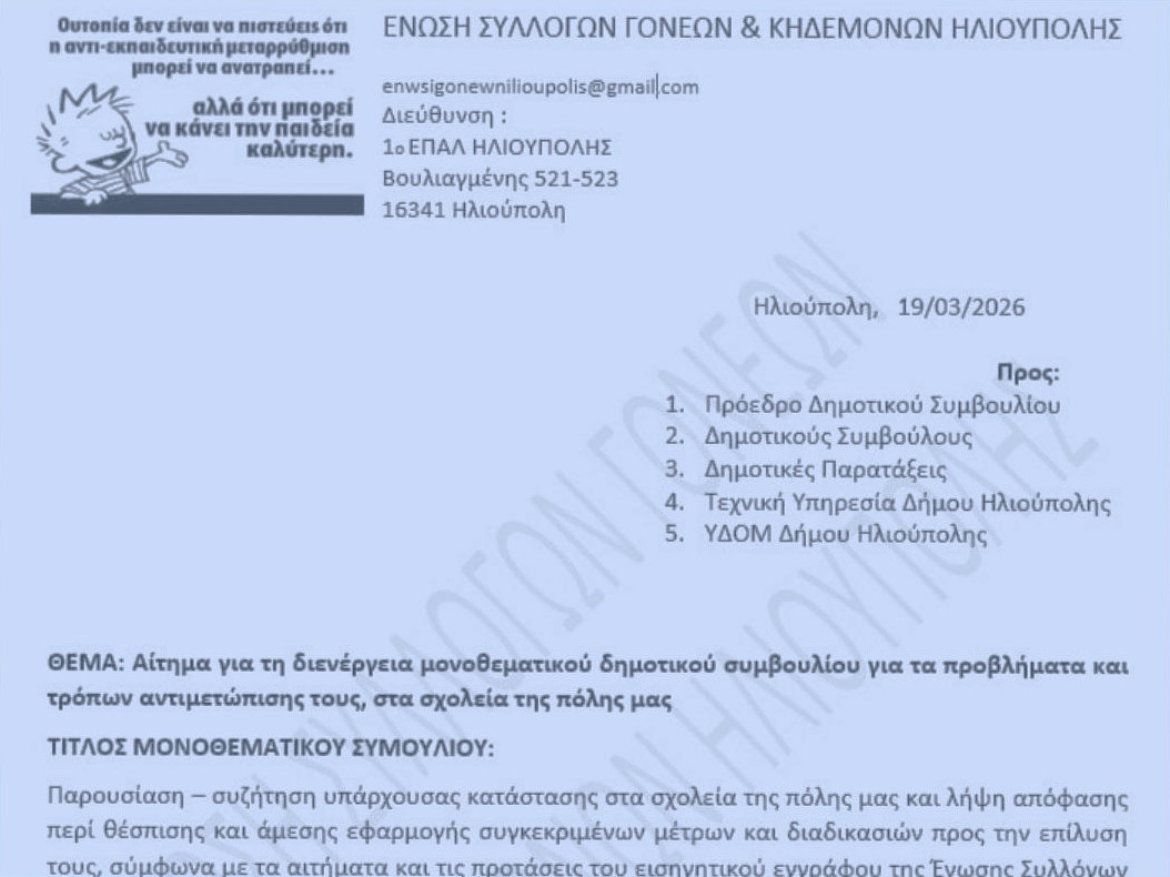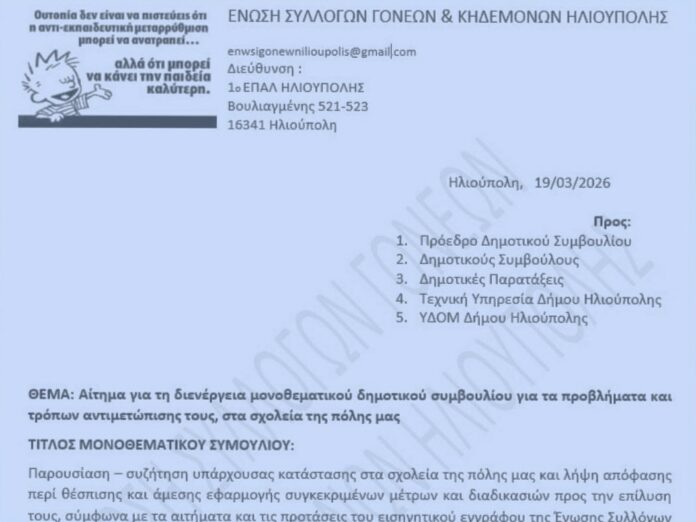Με έγγραφο αίτημα που απέστειλε στις 19 Μαρτίου 2026 η “Ένωση Συλλόγων Γονέων και Κηδεμόνων Ηλιούπολης” προς την Πρόεδρο του Δημοτικού Συμβουλίου, τους Δημοτικούς Συμβούλους, τις Δημοτικές Παρατάξεις, την Τεχνική Υπηρεσία και την Πολεοδομία – ΥΔΟΜ του Δήμου Ηλιούπολης ζητεί την σύγκληση μονοθεματικού Δημοτικού Συμβουλίου για τα προβλήματα και τρόπων αντιμετώπισης τους, στα σχολεία της πόλης μας, με τίτλο: