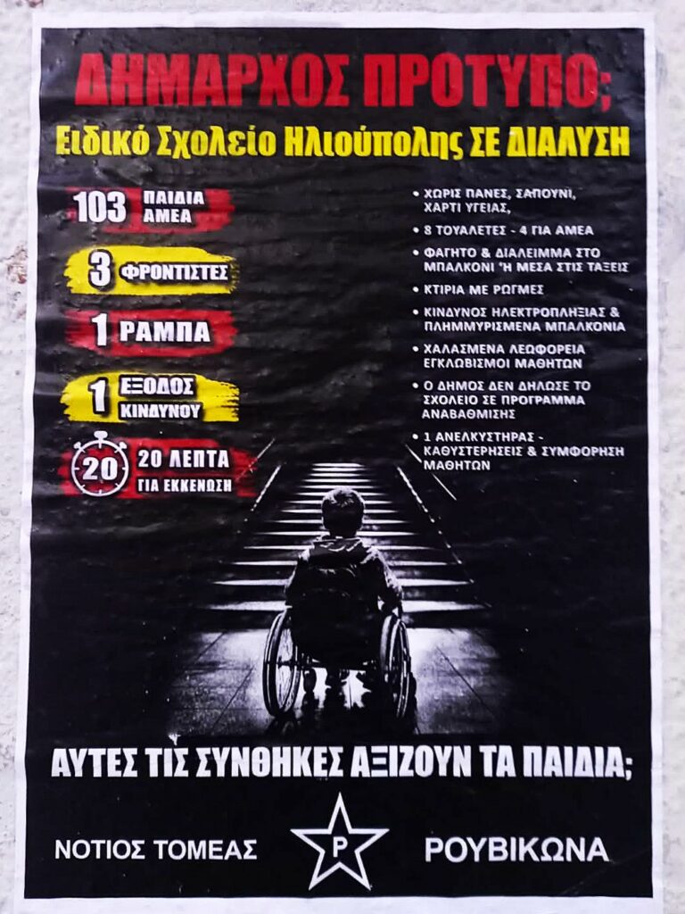 Σήμερα το πρωί έγινε αφισοκόλληση του Νότιου Τομέα του Ρουβίκωνα στο Ειδικό Σχολείο Ηλιούπολης.