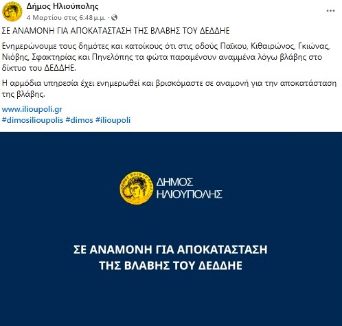 “ΣΕ ΑΝΑΜΟΝΗ ΓΙΑ ΑΠΟΚΑΤΑΣΤΑΣΗ ΤΗΣ ΒΛΑΒΗΣ ΤΟΥ ΔΕΔΔΗΕ. Ενημερώνουμε τους δημότες και κατοίκους ότι στις οδούς Παϊκου, Κιθαιρώνος, Γκιώνας, Νιόβης, Σφακτηρίας και Πηνελόπης τα φώτα παραμένουν αναμμένα λόγω βλάβης στο δίκτυο του ΔΕΔΔΗΕ. Η αρμόδια υπηρεσία έχει ενημερωθεί και βρισκόμαστε σε αναμονή για την αποκατάσταση της βλάβης“.
