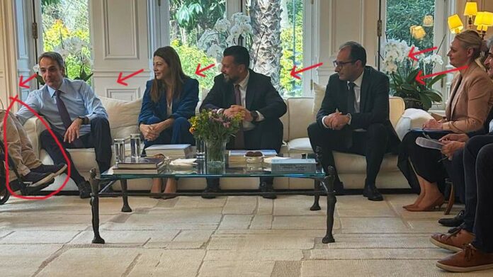 Στη βασική φωτογραφία της δημαρχιακής ανάρτησης διακρίνουμε τον Πρωθυπουργό και άλλους πέντε συμμετέχοντες, μεταξύ αυτών και το Δήμαρχο, να κοιτούν κάποιον που …λείπει από το πλάνο, προφανώς τον Παναγιώτη, που φαίνονται μόνο τα πόδια του.