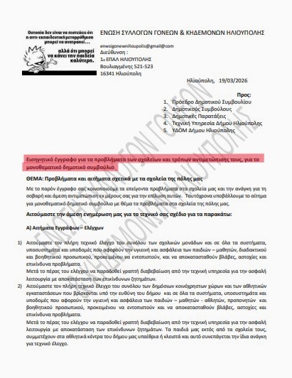 Με έγγραφο αίτημα που απέστειλε στις 19 Μαρτίου 2026 η “Ένωση Συλλόγων Γονέων και Κηδεμόνων Ηλιούπολης” προς την Πρόεδρο του Δημοτικού Συμβουλίου, τους Δημοτικούς Συμβούλους, τις Δημοτικές Παρατάξεις, την Τεχνική Υπηρεσία και την Πολεοδομία – ΥΔΟΜ του Δήμου Ηλιούπολης, ζήτησε τη σύγκληση μονοθεματικού Δημοτικού Συμβουλίου για τα προβλήματα και τρόπων αντιμετώπισης τους, στα σχολεία της πόλης μας, με τίτλο: