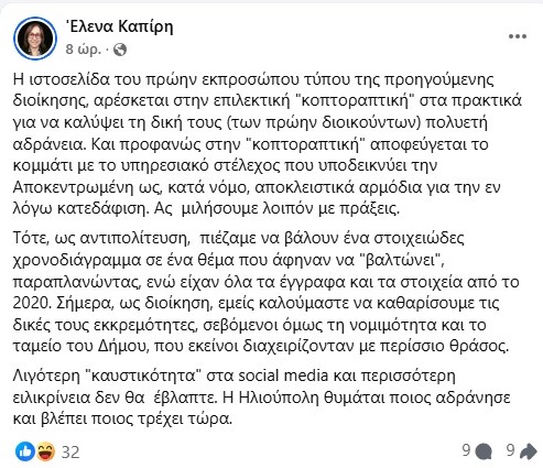 H κα Καπίρη βλέπει το “απόλυτο κακό” στην προηγούμενη διοίκηση, αλλά ακόμα το δικό τους έργο, επικοινωνεί ως επιτυχίες της σημερινής δημοτικής αρχής. Είναι καιρός να συνειδητοποιήσει ότι η αντιπολίτευση στην αντιπολίτευση δεν οδηγεί πουθενά. Έργο χρειάζεται…