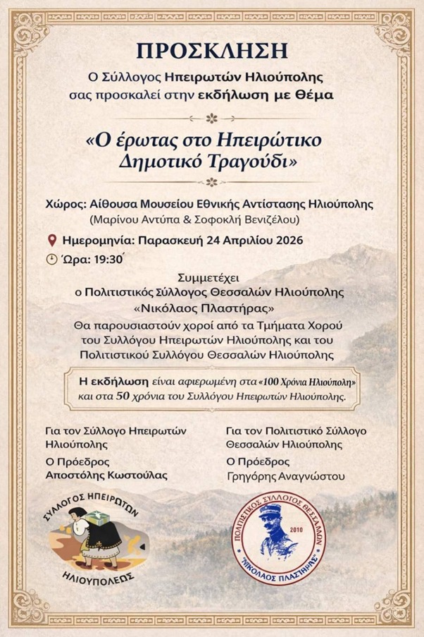 Μια πολύ ενδιαφέρουσα εκδήλωση διοργανώνει, στο πλαίσιο των εορτασμών για τα 100 χρόνια της Ηλιούπολης, ο “Σύλλογος Ηπειρωτών Ηλιούπολης” την Παρασκευή 24 Απριλίου, στις 19:00, στο Μουσείο Εθνικής Αντίστασης, με θέμα “Ο έρωτας στο Ηπειρώτικο Δημοτικό Τραγούδι“.