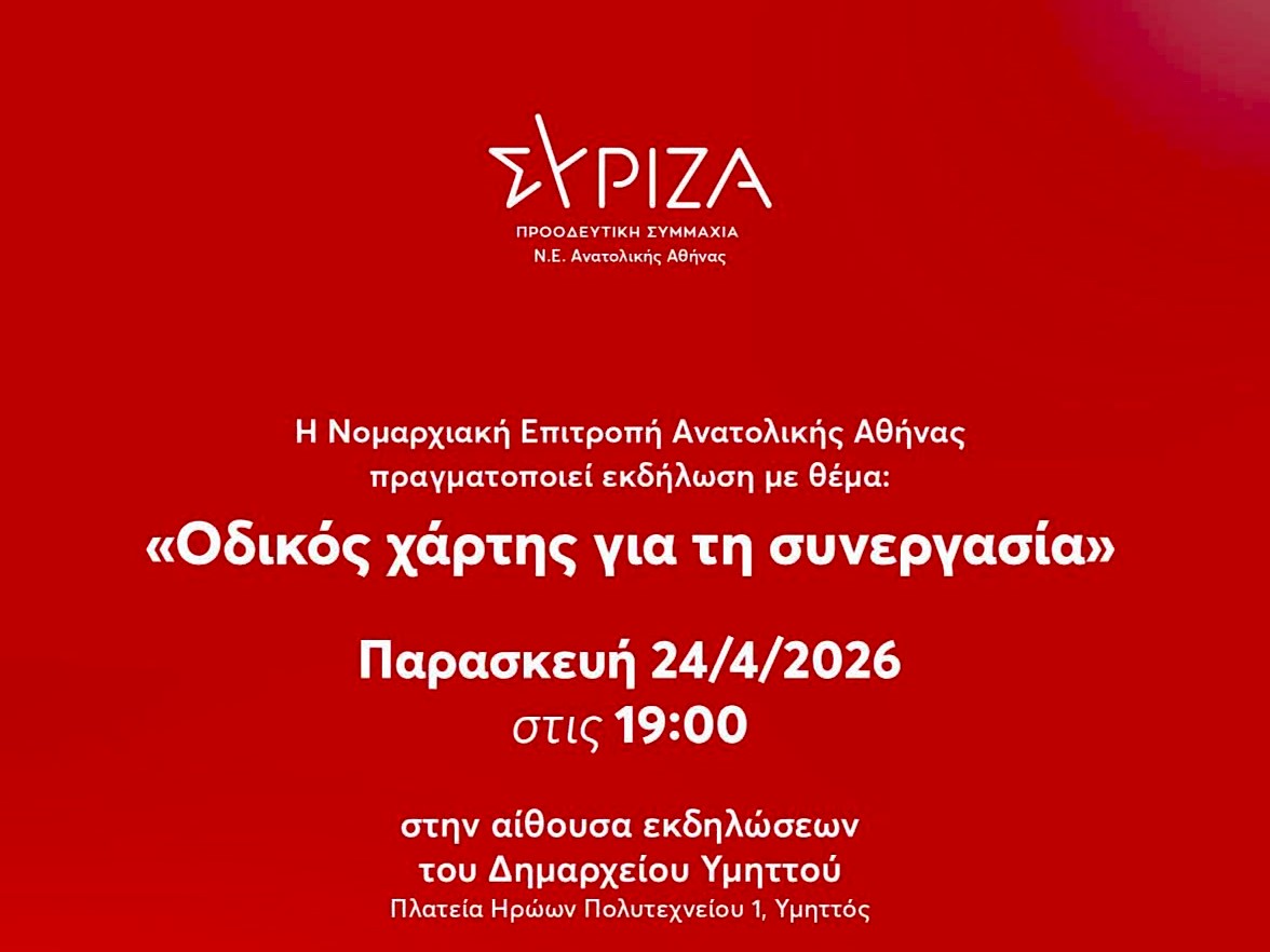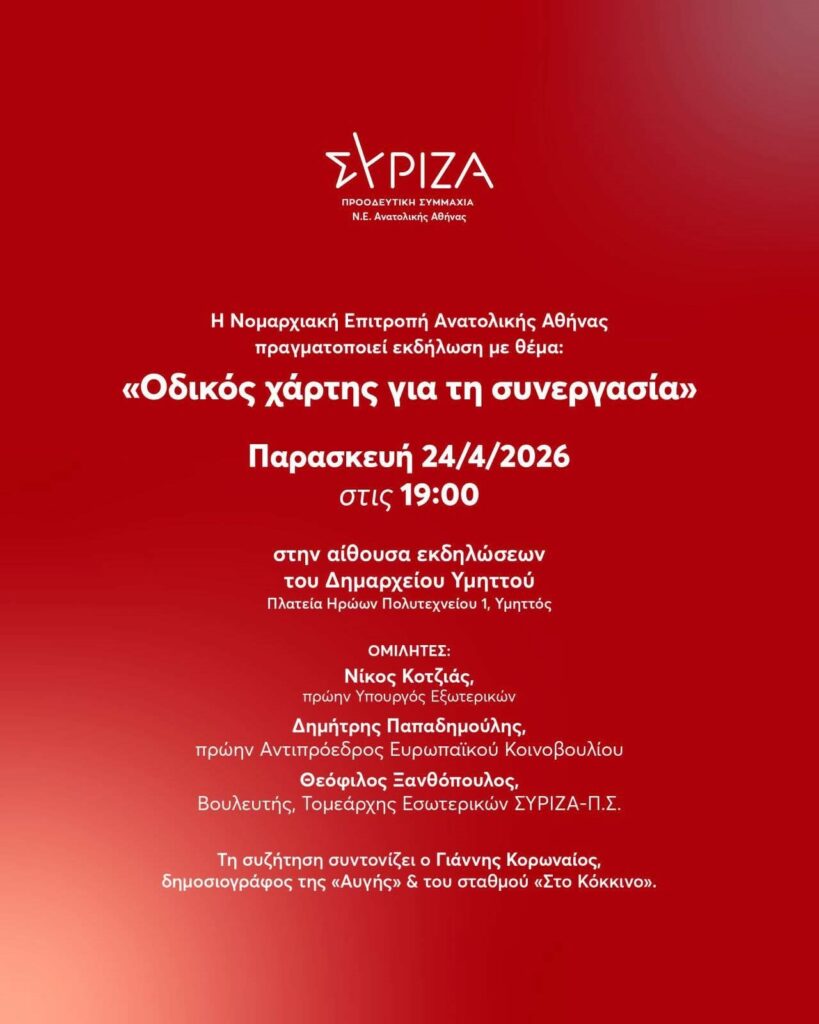 Οδικός χάρτης για τη συνεργασία“, την Παρασκευή 24 Απριλίου 2026, στις 19:00, στην αίθουσα εκδηλώσεων του παλαιού Δημαρχείου Υμηττού, Πλατεία Ηρώων Πολυτεχνείου 1, στον Υμηττό.